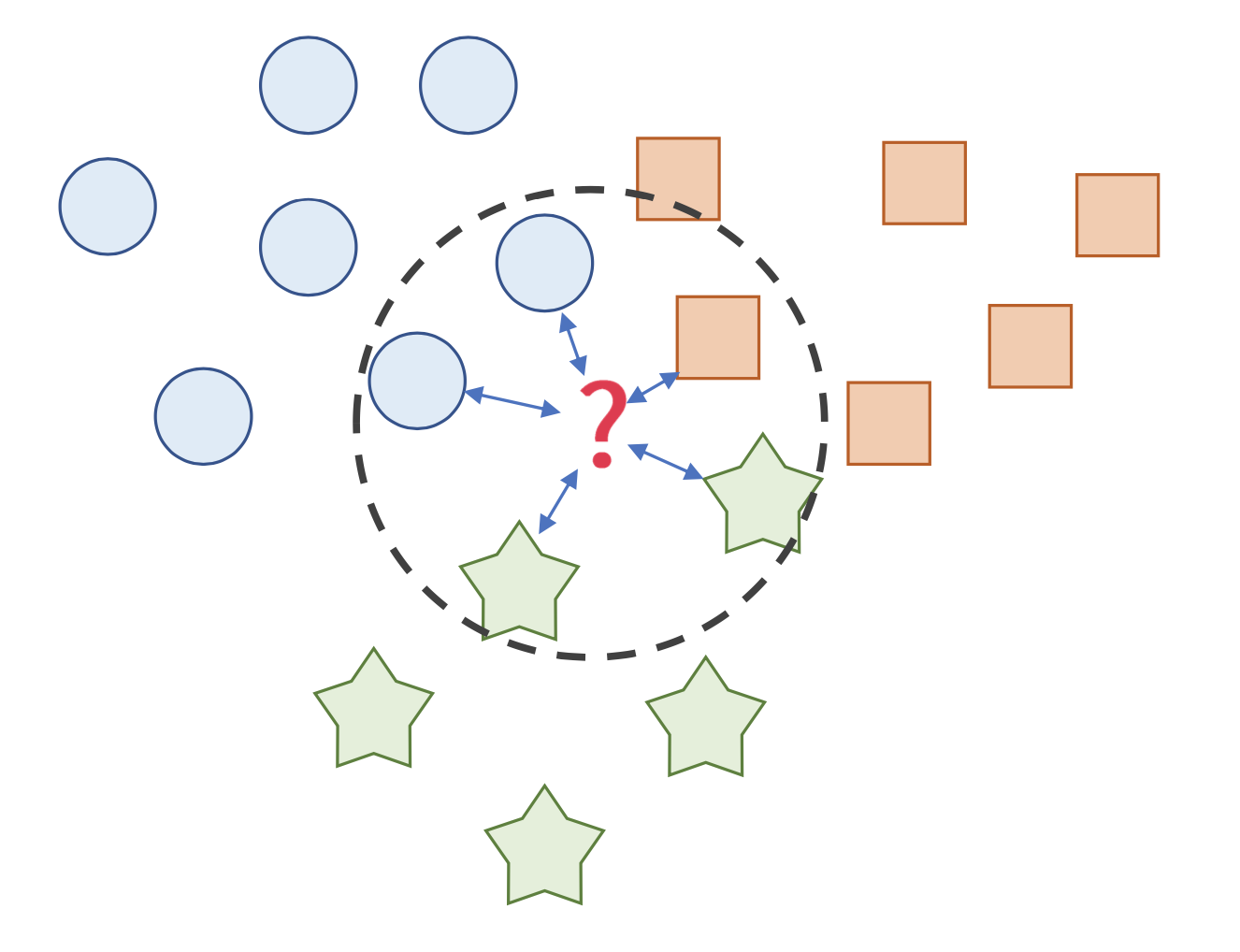 - 새로 들어온 데이터의 주변 k개의 데이터의 class로 분류하는 기법입니다.