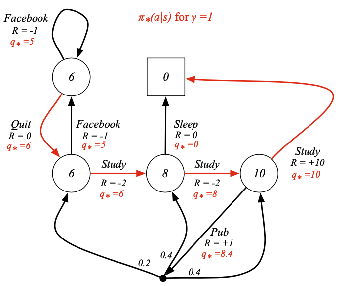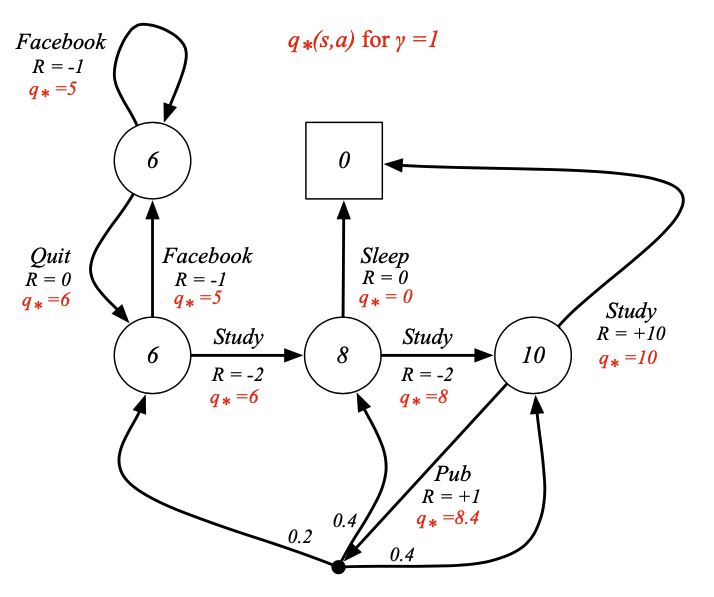 - 최적의 행동가치함수 $q_{*}(s,a)$는 행동값을 최대화하는 정책을 따른 것입니다.