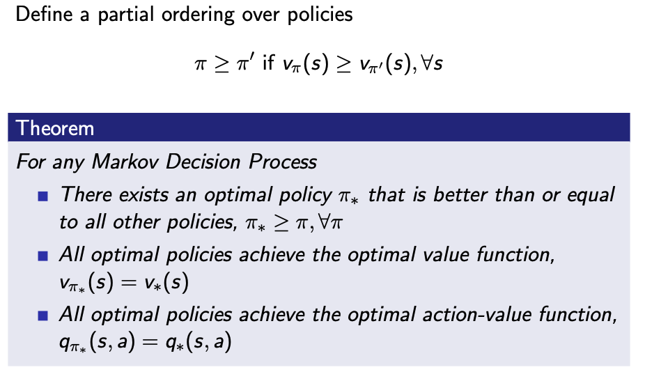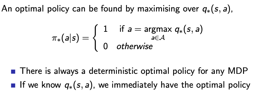- 위의 수식은 최대화하는 행동가치함수의 action을 찾았을 때 어떤 MDP이던 결정론적 최적 정책이 존재합니다.(왜냐? 최댓값은 1, 나머지는 0이기 때문 본질은 Policy는 Stochastic이지만 위의 수식은 Deterministic이다.)