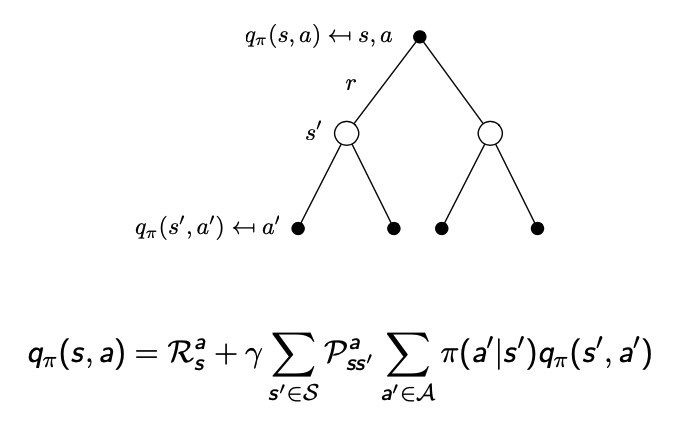 $$q_{\pi}(s,a) = E_{\pi}[R_{t+1} + \gamma q_{\pi}(S_{t+1}, A_{t+1})\mid S_{t} = s, A_{t} = t]$$