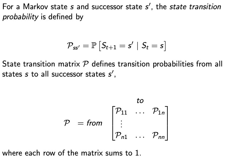 - 상태천이 행렬 $P$는 State $s$에서 다음 상태인 $s'$으로 갈때의 천이 확률을 정의합니다.