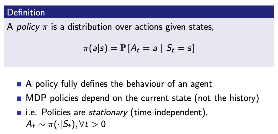 - policy는 Agent의 행동을 완전히 결정해줍니다.