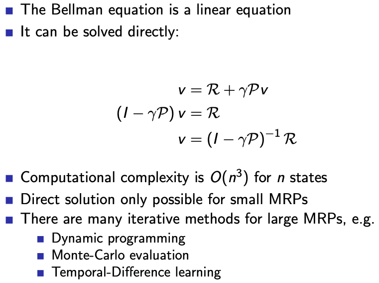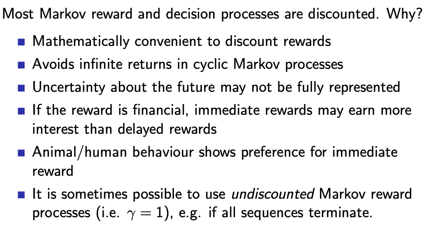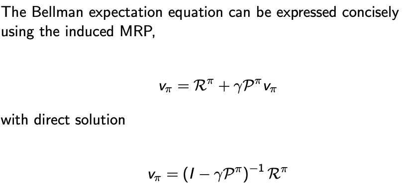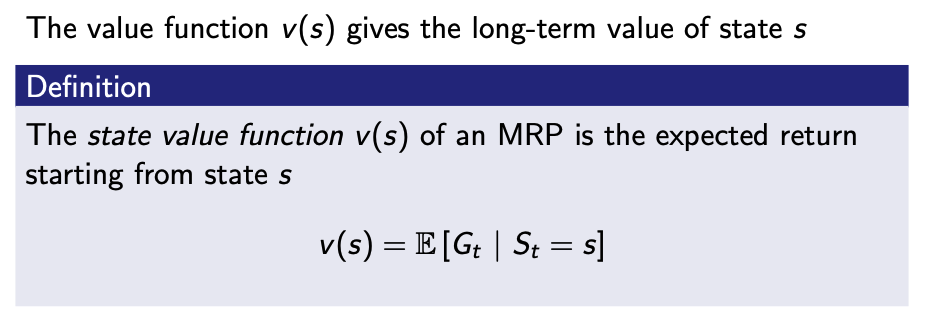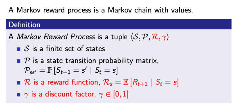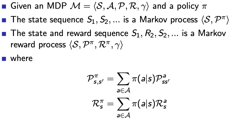 - 보상의 수열 $S_{1},R_{2},S_{2},...$는 MRP $<S,P^{\pi},R^{\pi},\gamma>$