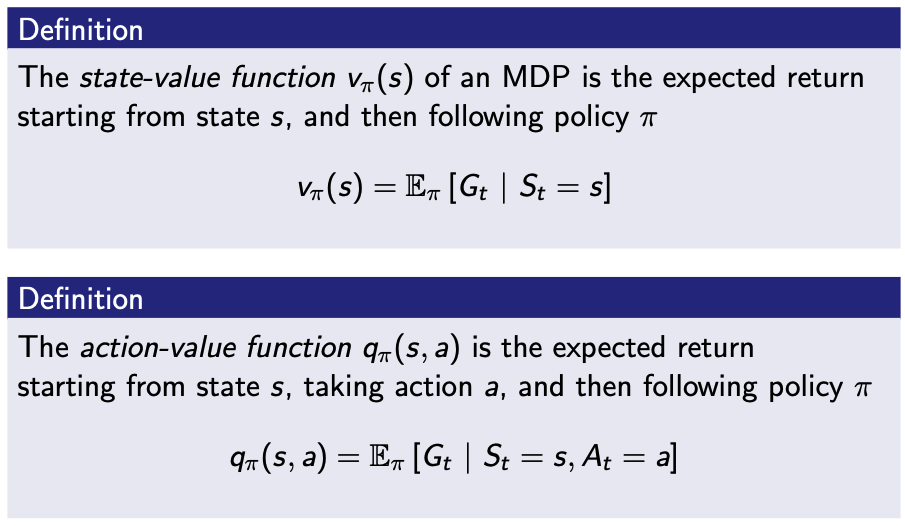 $$v_{\pi}(s) = E_{\pi}[G_{t} \mid S_{t} = s]$$