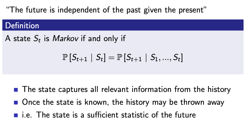 $$P[S_{t+1} \mid S_{t}\ = P[S_{t+1} \mid S_{1}, ..., S_{t}]$$