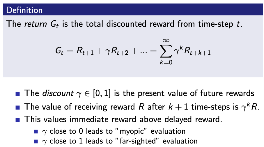 - Return은 미래의 보상을 총 합을 말하지만 미래의 보상에다 감가율을 곱합니다.