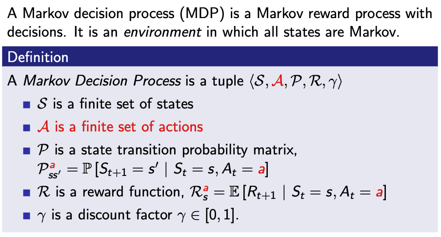 - 간결하게 말하자면 MDP는 MRP에서 Action만 더해진 것입니다.