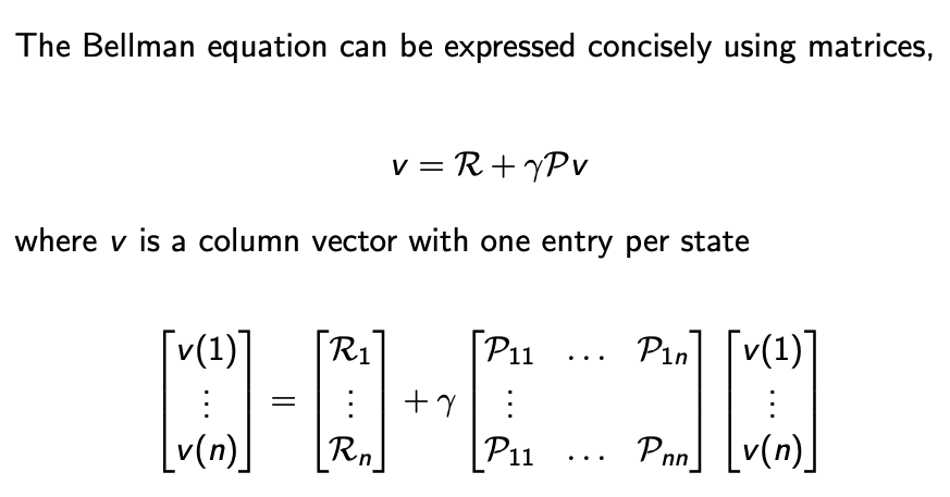 - 벨만 방정식은 간결하게 행렬을 사용하여 표현할 수 있습니다.