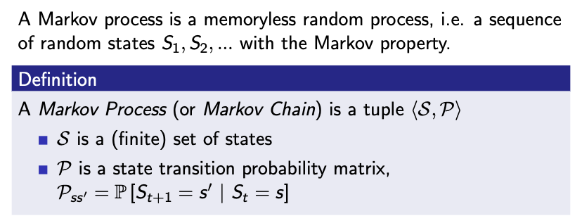 - Markov Process (또는 마르코프 체인) 은 $<S,P>$로 이루어져 있습니다.