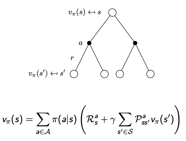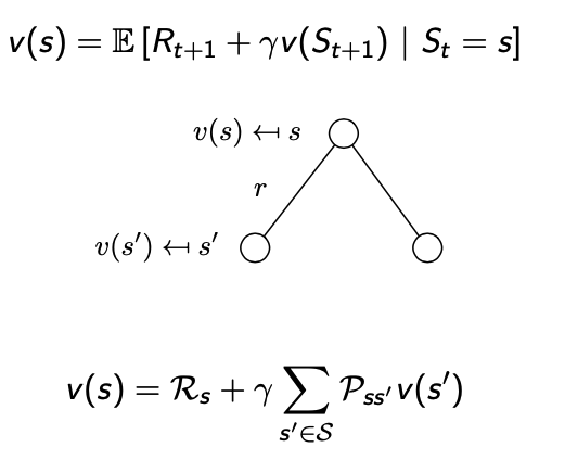 $$v_{\pi}(s) = E_{\pi}[R_{t+1} +\gamma v_{\pi}(S_{t+1}) \mid S_{t} = s]$$