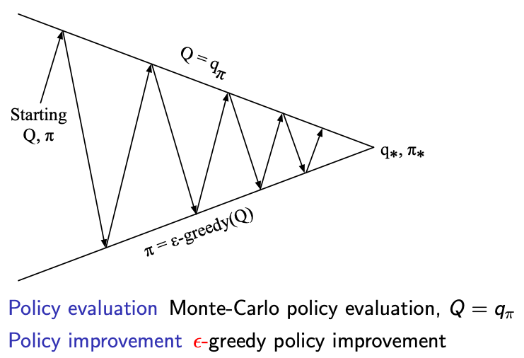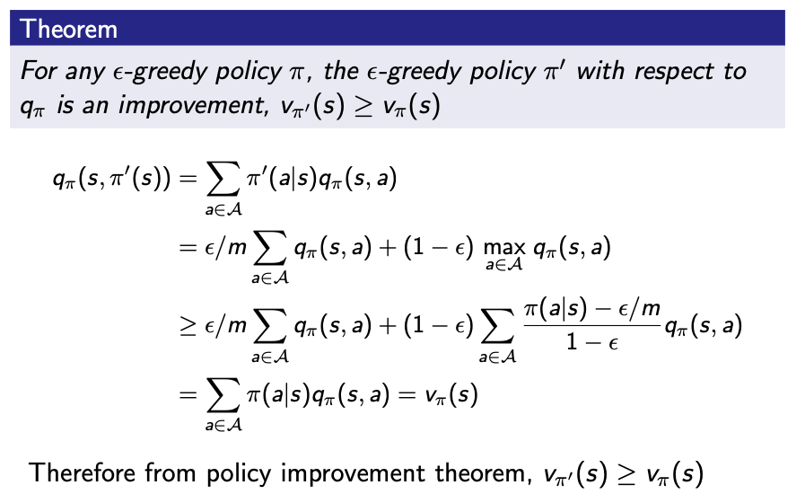 - greedy policy improvement 대신에 $\epsilon-greddy$ policy improvement를 사용합니다.