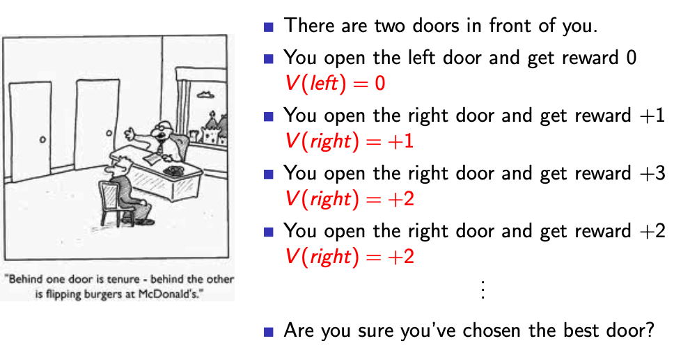 - 위의 예시같이 선택한다면 과연 가장 좋은 문을 선택할 수 있을까요???