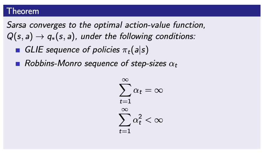 - Sarsa는 최적의 행동가치함수,$Q(s,a) \rightarrow q_{*}(s,a)$에 수렴합니다.