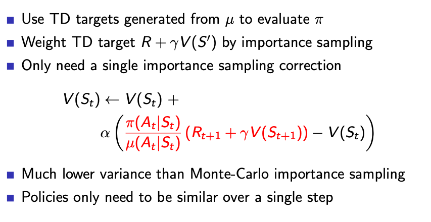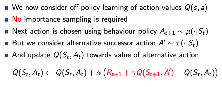 - Behavior policy를 통해서 Action을 하나 뽑고 Action을 수행합니다. $S_{t+1}$에 도착하면 behavior policy 대신에 target policy를 사용해주면 됩니다.