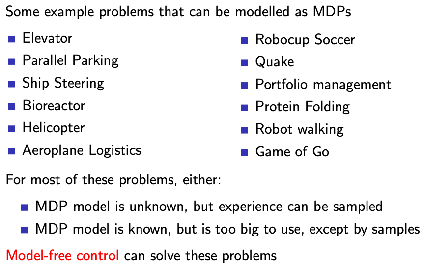 - MDP 모델은 알 수 없지만, 경험은 샘플링이 가능합니다.