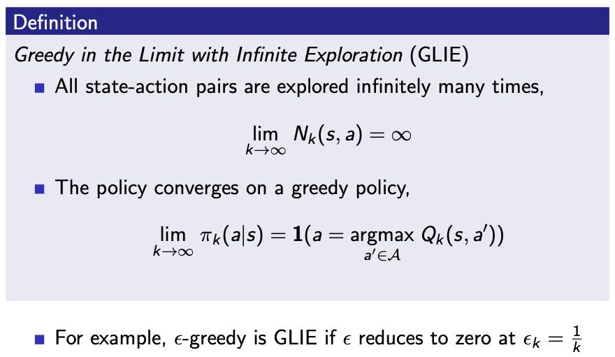 - GLIE Property(Greedy in the Limit with Infinite Exploration)