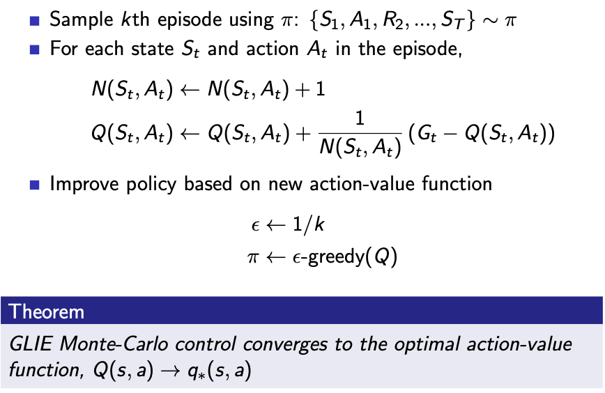 - GLIE MC control은 최적의 행동가치함수에 수렴을 합니다. $Q(s,a) \rightarrow q_{*}(s,a)$