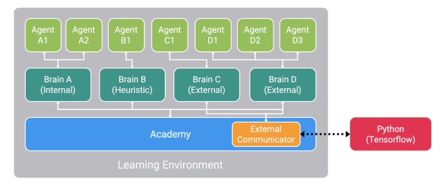 각 Agent의 행동은 Agent가 연결된 Brain(브레인)에 의해 결정됩니다.