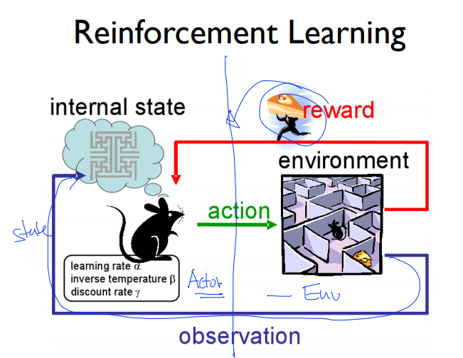 기본적인 구조는 Agent가 Environment에서 어떤 Action을 하게 되는데, Action을 할 때 마다 State가 변경됩니다. 관찰정보가 달라집니다.(Observation or State) 어떠한 행동의 끝에는 치즈를 찾는 것이 목표일 때 매 순간마다 잘했다 못했다의 지표가 주어지는 것은 아니지만 일련의 Action을 하다 보면 치즈를 보상으로 받게 될 수 있습니다.