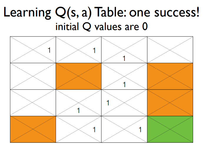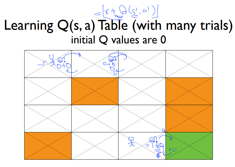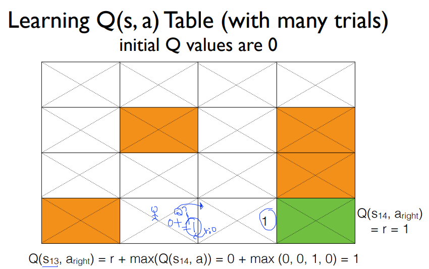 결과적으로 0으로 다 Initialize하였기 때문에 Q값은 계속 0을 받으며 아무곳으로 움직일 것입니다. 그러다 Goal의 부분앞에서 오른쪽으로 갈 Q에게 불어봅니다. 이렇게 수많은 시도를 통해 Q Table을 채워나갑니다.