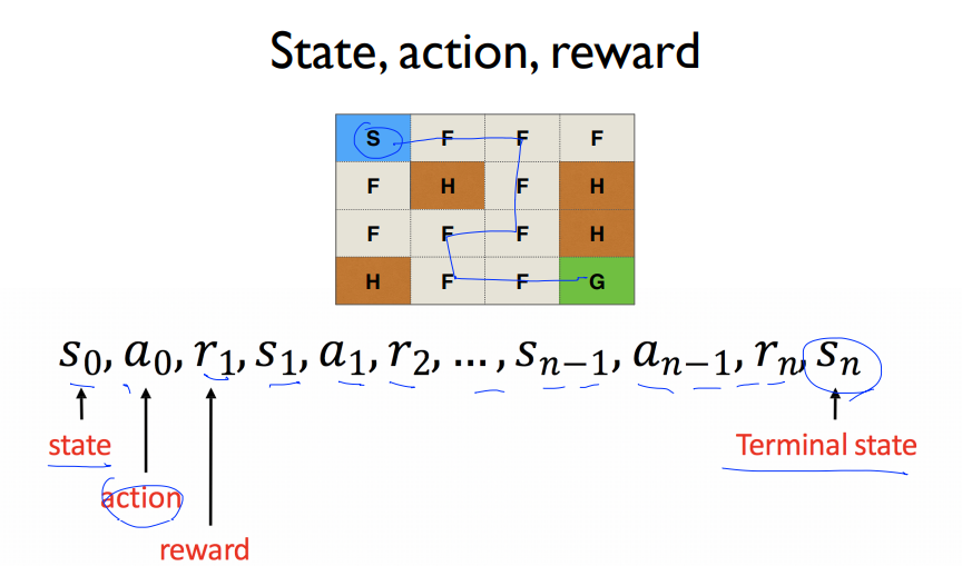- Action $a$를 했을 때 $r$이라는 reward값을 받게 됩니다.