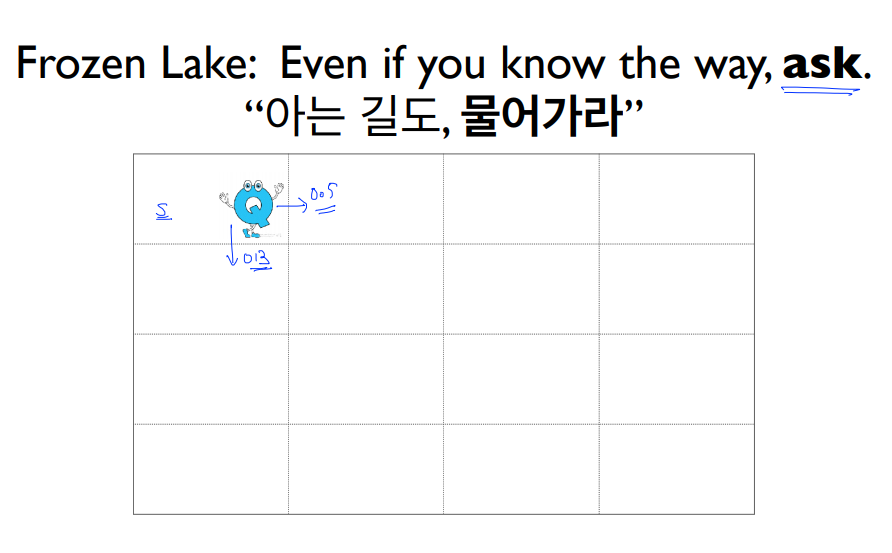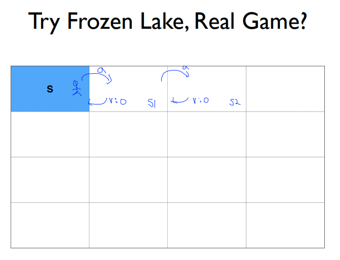 전의 Lecture에서도 설명했듯이 이 게임은 우리가 보기에는 쉬워 보이지만 Agent는 Enviornment를 전혀 모르기 때문에 Action을 통해서 State와 Reward값을 통해서 환경이 어떠한지 알아내야 합니다.