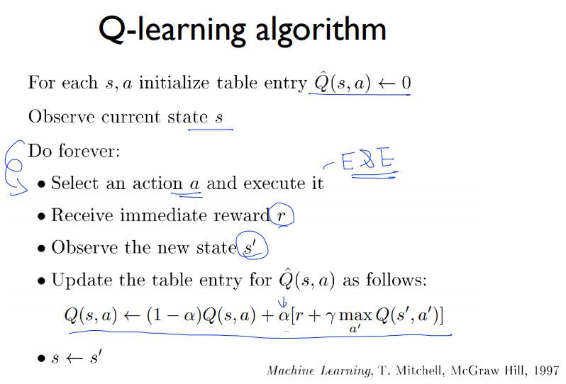 - Q를 업데이트 합니다.($\alpha$(Learning rate 사용))