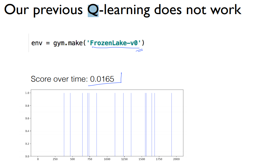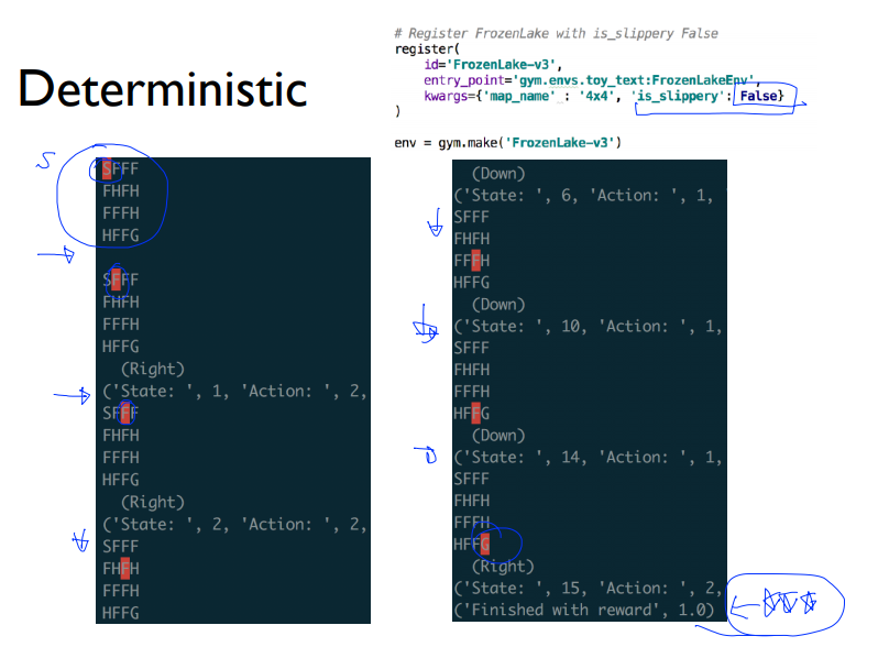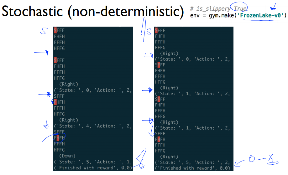 우리는 위에서 설명한 이것을 nondeterministic 즉 Stochastic이라고 부릅니다. 오른쪽으로 간다고 했을 때 오른쪽으로 갈수 없을 수도 있으며 다른 위치에 도착해 있을 수도 있기 때문에 보상도 다를 수 있습니다. 우리가 이전까지 했던 바람이 불지않는 Frozen Lake는 Deterministic Game이라고 부릅니다. 항상 정해져 있습니다. 오른쪽으로 간다고 했을 때 오른쪽으로 가지게 되며, 이동에 대해 같은 보상을 받게 됩니다.