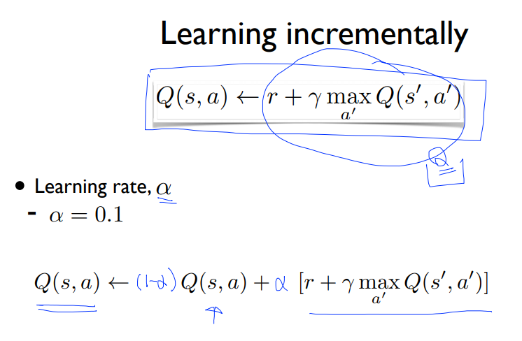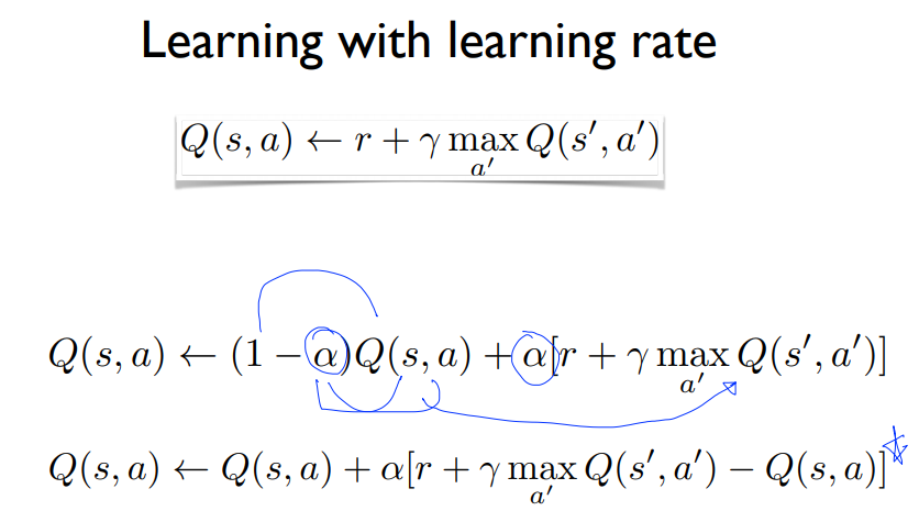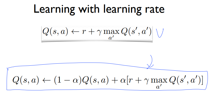제일 위의 식은 이전에 Q를 업데이트 시켜왔던 방식입니다. 저 식을 10%만 받아들인다는 것입니다. 이것이 바로 Learning rate입니다.
