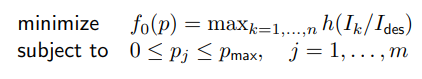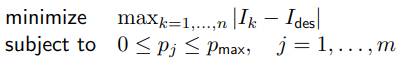 3. weight least-squares 사용 : $$minimize \ \ \sum^{n}_{k=1}(I_{k} - I_{des})^{2}+\sum^{m}_{j=1}w_{j}(p_{j}-p_{max}/2)^{2}$$