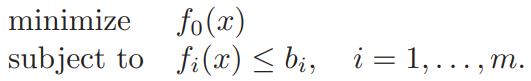 - function $f_{i}:R^{n}\rightarrow R, \ i=1,...,m$ : $(ineuqality) \ constraint \ functions$